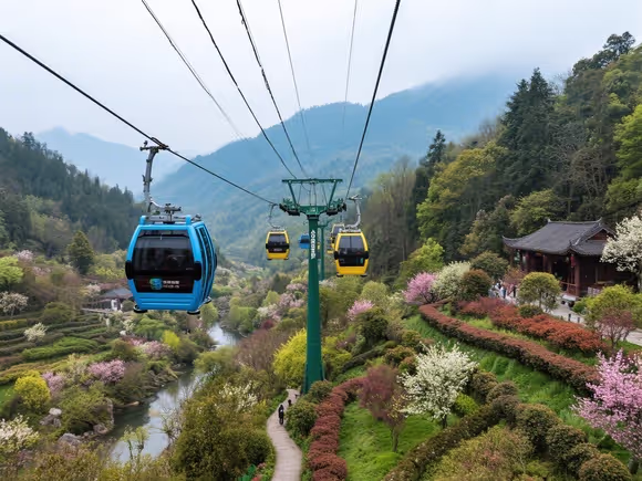 索道是连接景区不同区域的重要交通工具,尤其适合游客快速抵达山顶景点(如药王大佛、辛夷花海),避免徒步攀爬的劳累。例如,从山脚到山顶的索道单程约需 10-15 分钟,可节省体力用于游览核心景观。